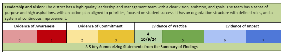 | Leadership communicates consistently with staff and the community around initiatives that are aligned with the priorities. | While all stakeholders identified that Strategic Priorities were posted on a wall, a system of shared leadership would create collective wisdom across all groups. |